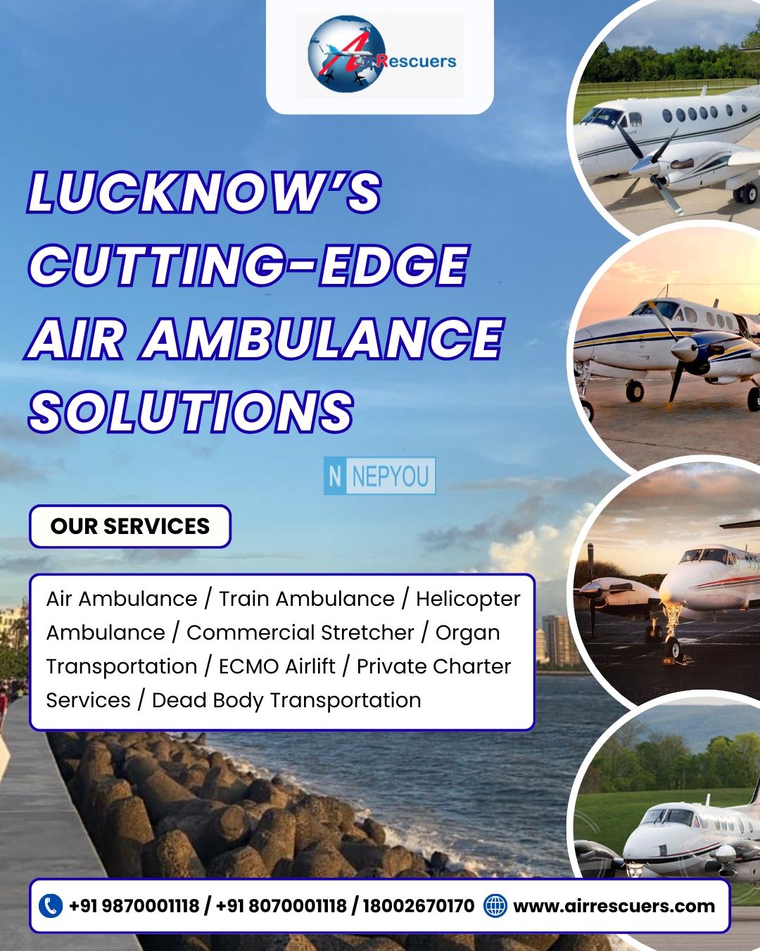 Experience fast, reliable, and state-of-the-art air ambulance services in Lucknow. Our advanced medical aircraft are fully equipped with ICU facilities, modern life-support systems, and highly trained medical professionals to ensure safe, swift, and secure patient transfers. Available 24/7 for emergencies, intercity, and international medical evacuations. Your life-saving partner in critical times.